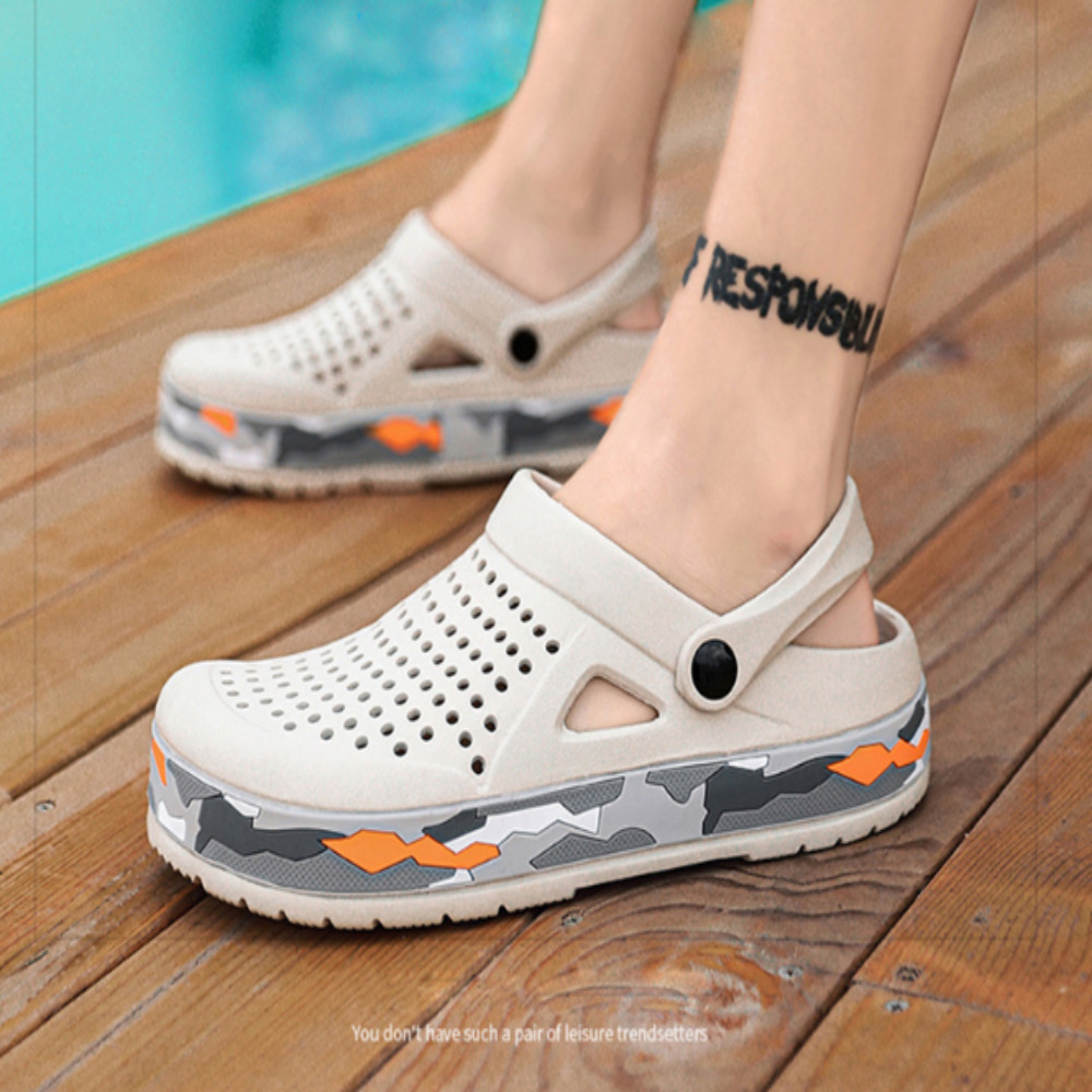 크록스 느낌의 감성 디자인에 측면에는 위장 패턴 같은 그래픽 요소가 들어가 있어 밋밋하지 않고 포인트 신발로도 손색이 없다.